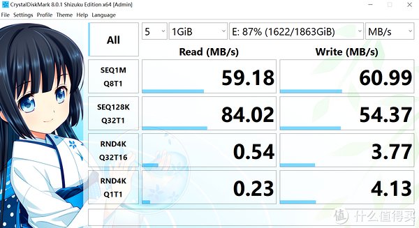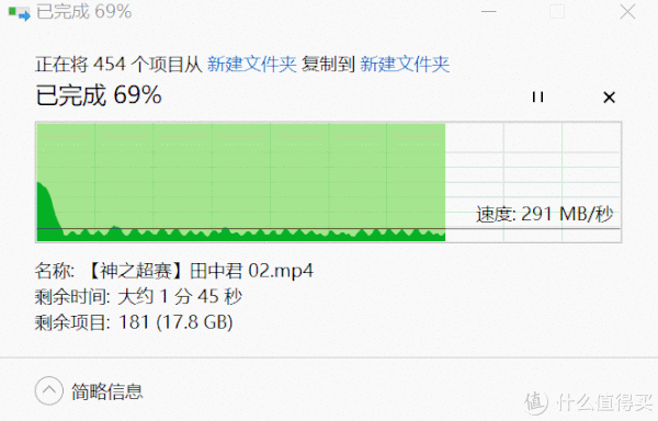 没有独立缓存的加持会影响速度,但是本硬盘在75%占用时仍然能保证10GB左右的高速顺序写入。本盘会掉速,但在快写满的情况下,均速也很难掉到200MB/s以下。所以很多人恐惧的“缓外只剩几兆”比机械盘还慢的情况应该不会出现。